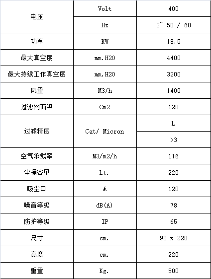 吸塵系統是旁路馬達,由風扇和馬達軸直聯而成,無傳輸裝置,因此完全免維修,適應于24小時高強度作業,操作時噪音低,性能優 。當機器過熱時會自動切斷電源,停止工作??刂瓢逶O在機器的后面,有ON和OFF開關(IP65),一個緊急關閉開關和軟開啟按鈕。真空指示器會不停地監視吸塵過程,避免堵塞或異常。同時泄壓閥保護馬達避免因濾袋堵塞或其他吸塵系統的破損而造成的過熱。出風口處的濾袋減少流出氣體的噪音并達到降速。配備遠程遙控開關,便于集塵系統高效開始/關閉。